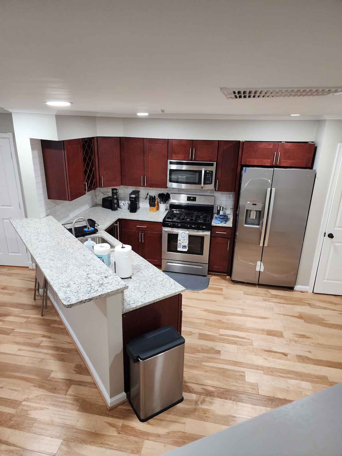 Enjoy your stay in this cozy, newly remodeled Tudor home in a historic and architecturally eclectic neighborhood in Catonsville, MD! You’ll be close to everything but far enough to enjoy a relaxing trip. The home features Four bedrooms, two full baths, a fully stocked kitchen, a full basement, and 18ft ceilings on the main level. You will enjoy 65, 42, and 32-inch smart TV's throughout the home. In addition, a private upstairs main suite with King size bed, sofa seating area, and workstation.