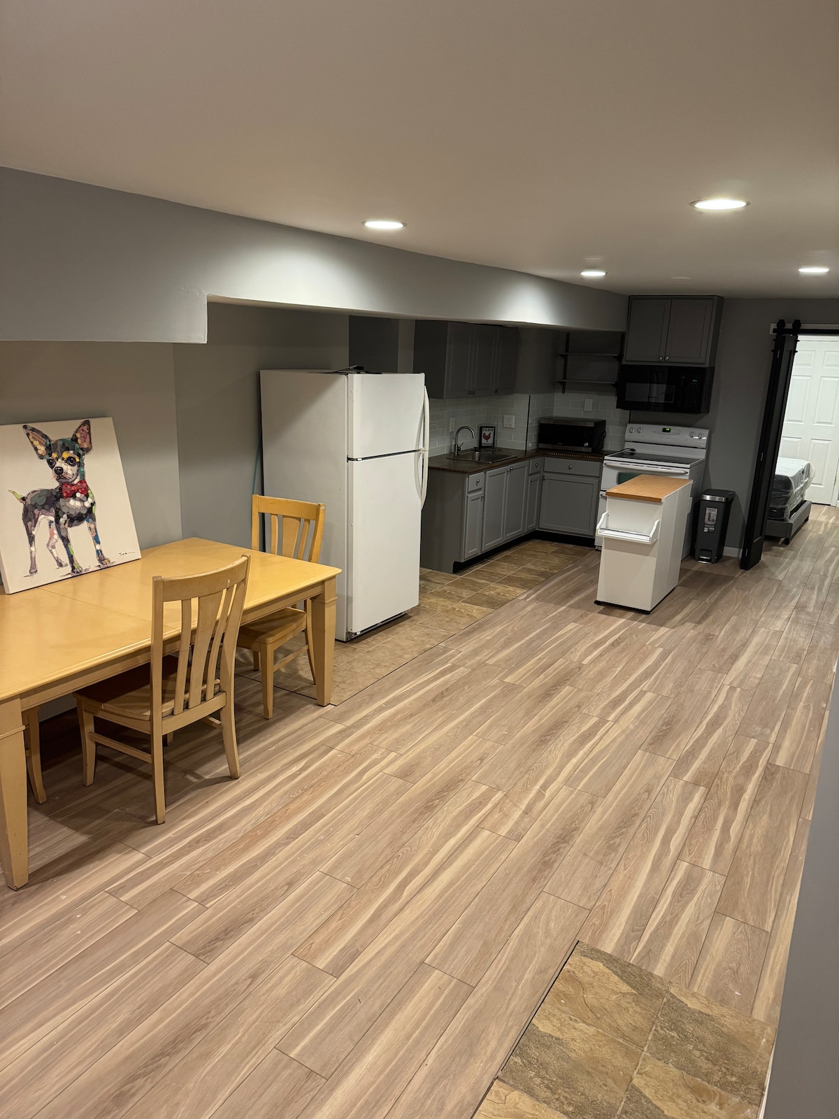 Entire basement only not the entire house. A basement apartment recently renovated with 2 bedrooms, luxurious full bathroom, powder room, full kitchen, dining room, living room, laundry in the unit, private entrance, private parking (max 2 cars). Host lives upstairs with 1 dog (labradoodle). Everything in the basement is not shared with the host. Pets allowed with $75/trip fee, no fee for service dogs (Note: emotional support animals are pets) 0.5 mile from I-95, 20 minutes from BWI airport.