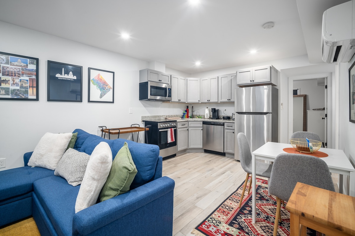 Newly Renovated! Welcome to one of the hippest parts of DC. This 1 bedroom /1 bathroom English Basement Apt. is full of natural light. Located just two blocks above U St. (shopping, bars, metro 7 min walk, restaurants) Bedroom features Queen Sized Bed & attached bathroom, Fully equipped Kitchen with Keurig Coffee Maker, Central A/C & Heating, WiFi , 43” Smart TV (Live Sling Cable , Netflix, Hulu, Amazon or YouTube account) , Clothes Washer/Dryer Combo. Bath products included. Dogs welcome!