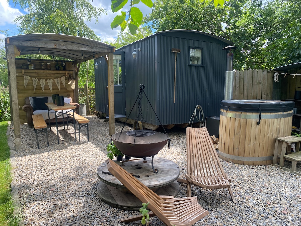 Come and stay in our beautifully finished, tin shepherds hut at the bottom of our garden. We are located in the rolling countryside with extensive views over the vale of York. After a day of exploring this AONB, there’s nothing like cooking tea over the fire pit or wood pellet pizza oven followed by a dip under the stars in our rustic hot tub. Fall into a fresh clean bed and wake up to the sound of the dawn chorus. Our bathroom barn provides all your needs for a morning freshen up!See you soon.