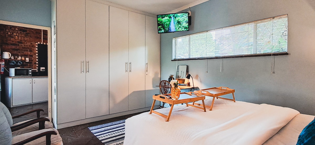 NO LOAD SHEDDING This listing has Backup Solar Power. 1 bedroom separate living room, open plan kitchen/dining room. You have the entire flat to yourself. This is a comfy and very spacious flat, tastefully decorated, with lots of light. All the rooms open onto the pool deck. Enjoy the beautiful birdlife in the garden and the adjacent natural forrest. You will have your own private entrance and undercover parking. Free wifi, DSTV (cable tv).