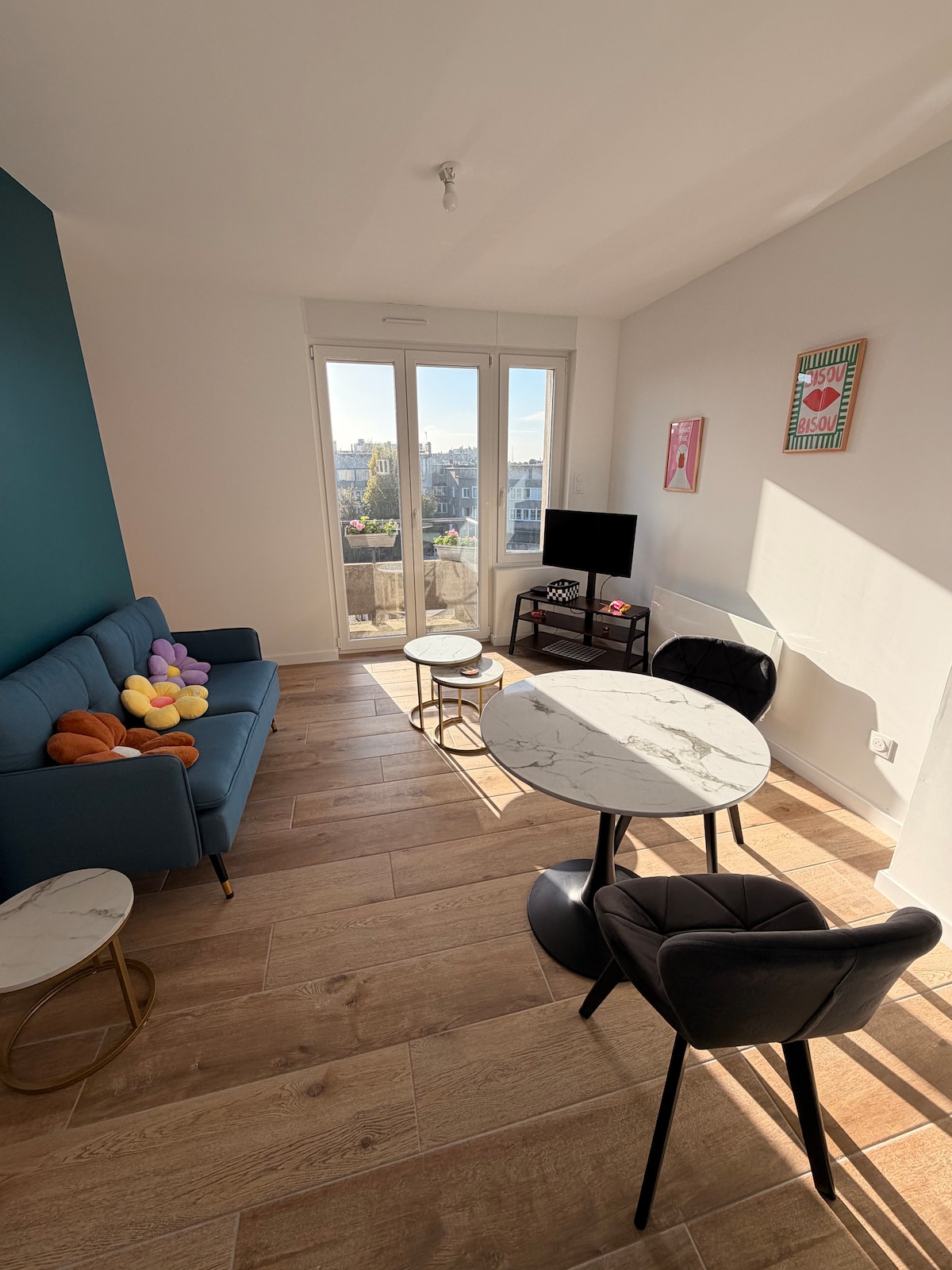 Bienvenue au Studio Le Plumard Bleu. Idéal pour les travailleurs ou les couples, parking rue gratuit, à 3min de l'autoroute, 10min à pied de la gare, bus gratuit à 50m vous emmène à la plage (C3). Quartier calme, parfait pour télétravailler (wifi). Studio lumineux (avec volets) situé dans un bâtiment de la reconstruction entièrement rénové (thermique et fonctionnel) et classé 2 étoiles. Il se distingue par sa conception alliant espaces sur mesures et une décoration élégante et pétillante.