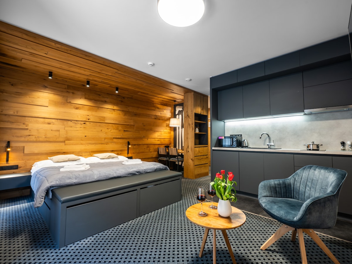 Skog is modern apartment designed in a minimalist Scandi style, using mostly natural materials in the interior. It has about 70m2 and includes 2 separate bedrooms. One is in the attic with lower ceiling. A spacious terrace belongs to the apartment. It is situated in the neighbourhood with some other built houses in similar style within walking distance to the centre. Mumlava waterfall is only 10mins forrest walk. 007 building (gym and squash centre) is being renovated from 07/2025 to 03/2026.