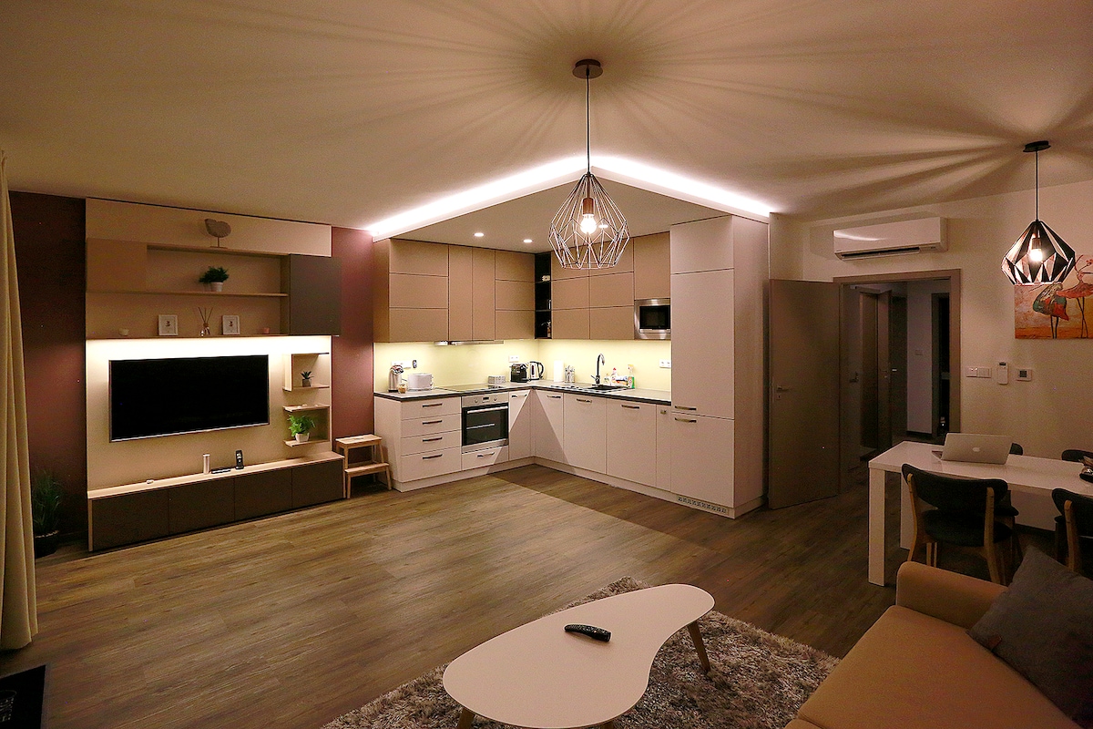 Apartment #57 „Barcelona“ 3+kk 79 m2 on the top floor of a new building with a balcony. Closed VIP floor with chip lift, 100% security, service and comfort. Air conditioning (heating / cooling), full equipment incl. dishes and towels. 300 meters from the center - Poděbrady colonnade, 2 minutes from the railway and bus station - 55 minutes to the center of Prague. Internet 350 Mbit Up & Down without limits !!! WiFi full coverage. 4K 55''TV. Washer & dryer, dishwasher, fridge / freezer, microwave.