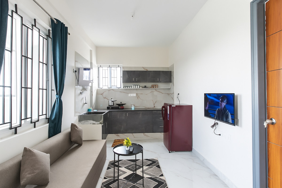 Note: Due to local regulations, currently hosting Indian guests only Premium 1 BHK on FF, ideal for upto 4 guests, in HSR Sec.2, steps from cafés, supermarkets, parks & a lake With queen bed, sofa bed, sofa, crisp white bed and bath linens, study table, dining table, dressing mirror, wardrobe, 43" Smart TV, 200 Mbps Wi-Fi, fridge, induction stove, kettle, cookware, basic cooking ingredients, dinner set, RO water, cloth washer, drying stand, geyser, toiletries, hair dryer, iron table & inverter