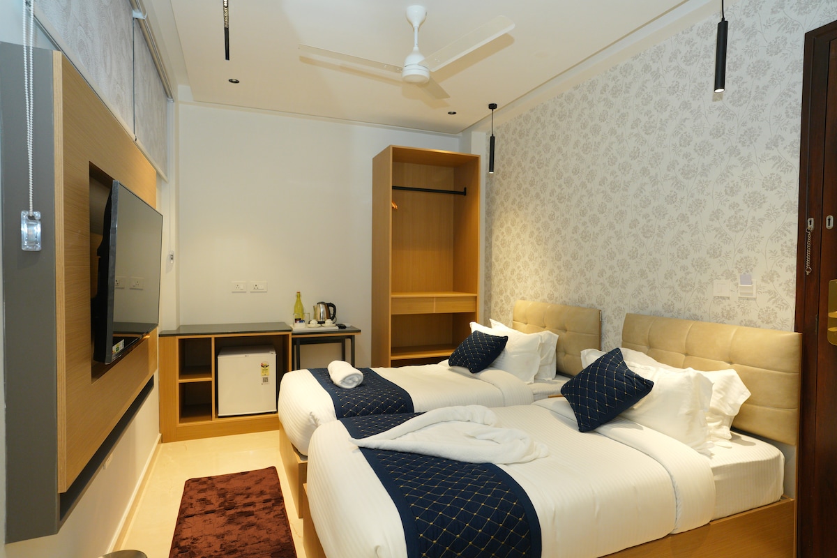 Triente Suites, Premium Apartment Hotel in Kalyan Nagar, Bangalore. One bedroom in a 2bhk apartment is provided . Triente Suites is a spacious apartment hotel located in Kalyan Nagar, 33 kms from the Bangalore International Airport and 17 kms from Bangalore City Junction. Each apartment has 2 bedrooms, a living area, dining room and kitchen. We have 8 apartments with a choice of king-size, queen-size or twin beds and can accommodate 32 guests. free Wi-Fi and private car park for our guests.