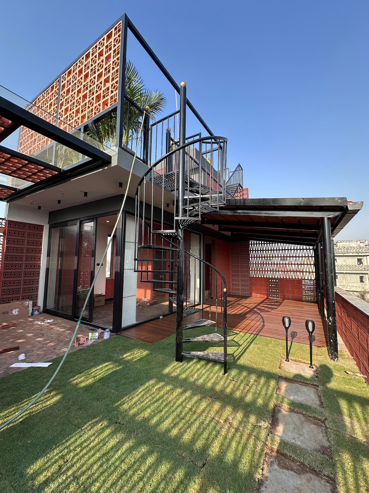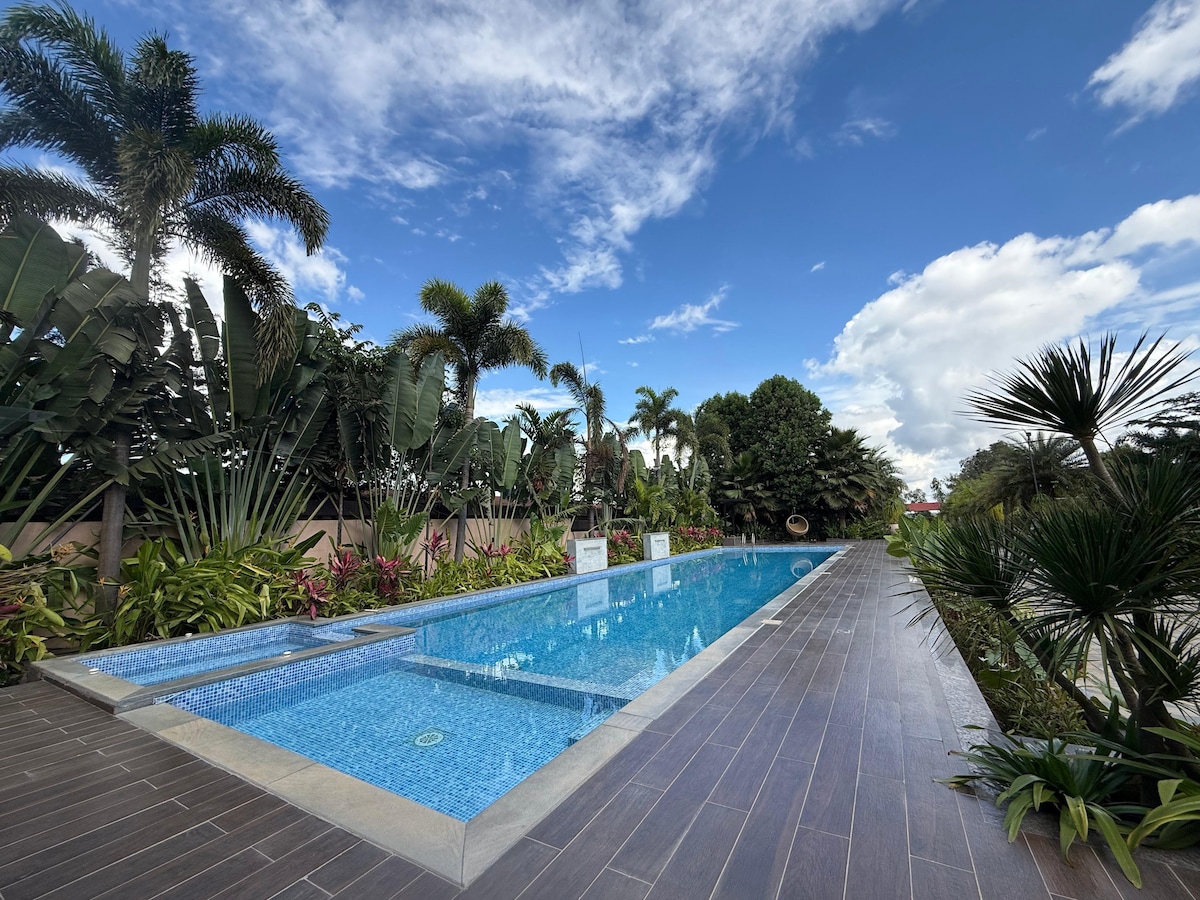 Discover EL Palm House: a tranquil oasis near the city's IT hub. 10min from RGA Tech park. 15min from RMZ Eco World. This independent home in a serene layout features a lush lawn, backyard, plunge pool, fully equipped kitchen. OUTDOOR SHOWER AREA (covered yet outdoor) Embrace the tropical vibe surrounded by palm plants. Experience the harmony of city life and nature's embrace at EL Palm House, where every moment is an invitation to relax and rejuvenate.