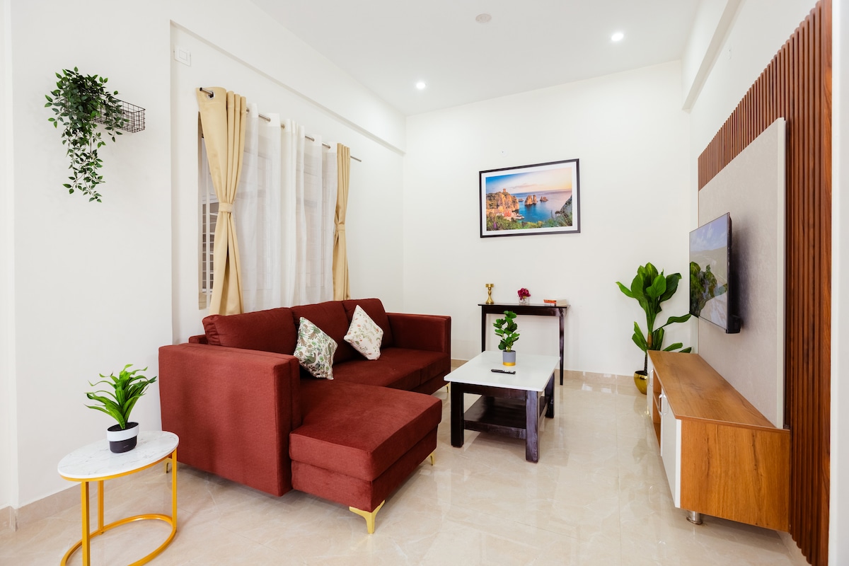 Note: Due to local regulations, currently hosting Indian guests only Nestled on a serene lane between 27th & 24th Main, the stay is steps away from restaurants, hypermarkets, hospitals, and lush parks With queen bed, crisp white bed and bath linens, study/dining table, dressing mirror, wardrobe, 50" Smart TV, Wi-Fi, fridge, induction stove, oven, kettle, cookware, basic cooking ingredients, dinner set, RO water, cloth washer, drying area, geyser, toiletries, hair dryer, iron table & inverter