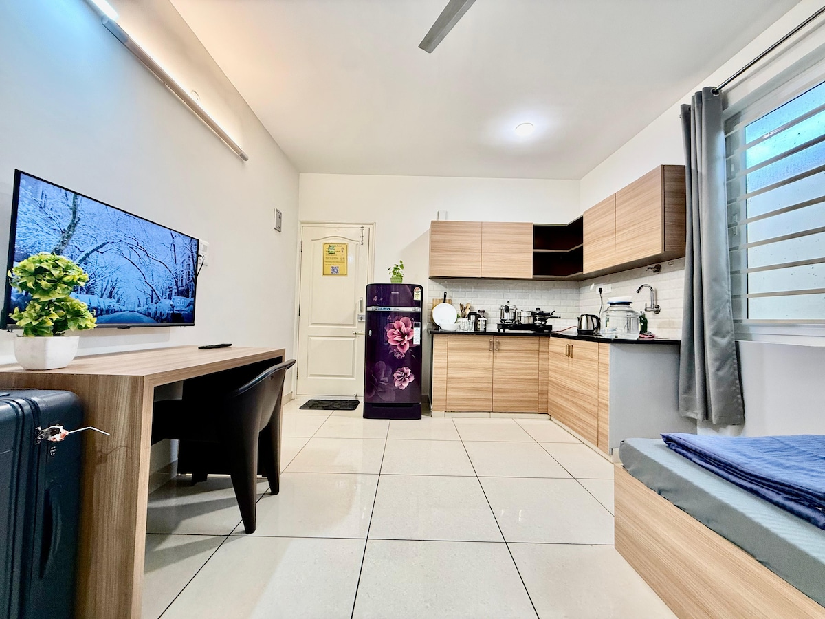 Nestled in the heart of Whitefield, surrounded by lush greenery, our premium 1 BHK apartments are meticulously designed to offer high-quality stay experience and extreme comfort. We have used wakefit 10" memory foam mattresses in bed room and amoeba sofa cum bed in the hall, to offer ultimate sleep quality and back support. We designed our kitchen spaces with modern kitchen utensils - including mini bar set. Other amenities include 100 Mbps WIFI, proximity to the Metro station, and IT hubs.