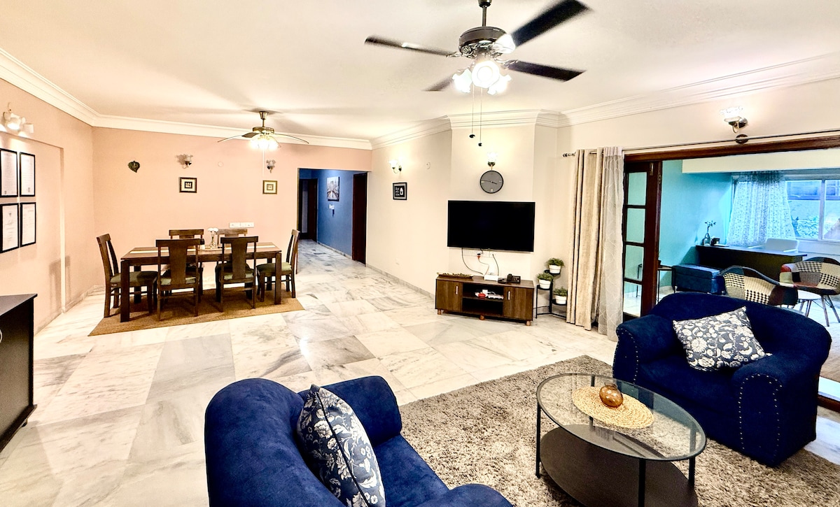Our property has a 50-inch TV with Amazon Prime, with comfy sofas and a 6-seater dining table. The kitchen boasts a 4-burner gas stove, fridge, microwave, dishwasher, washing machine, all the pots and pans for cooking. The master bedroom's king-size bed with a 10-inch orthopedic mattress, accompanied by a balcony offering picturesque views. The adjacent bathroom ensures convenience. The second bedroom is ideal for work or relaxation, with a study desk and an attached bathroom for added comfort.