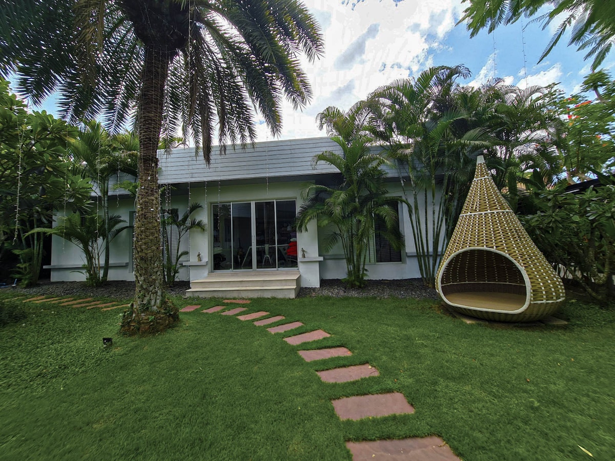 The BEAUTIFUL vacation 3 bedrooms cozy home with private swimming pool. Only 3km. to the beach and Golf club! The villa is in the private and close community, with 24 hrs. security guard. The design values simplicity to create a sense of well-being, water feature and landscape as a focal point to be readily accessible from around the house. Our cozy cottage-inspired house design in a modern classic package creates welcoming living space, with the sense of being one with nature.