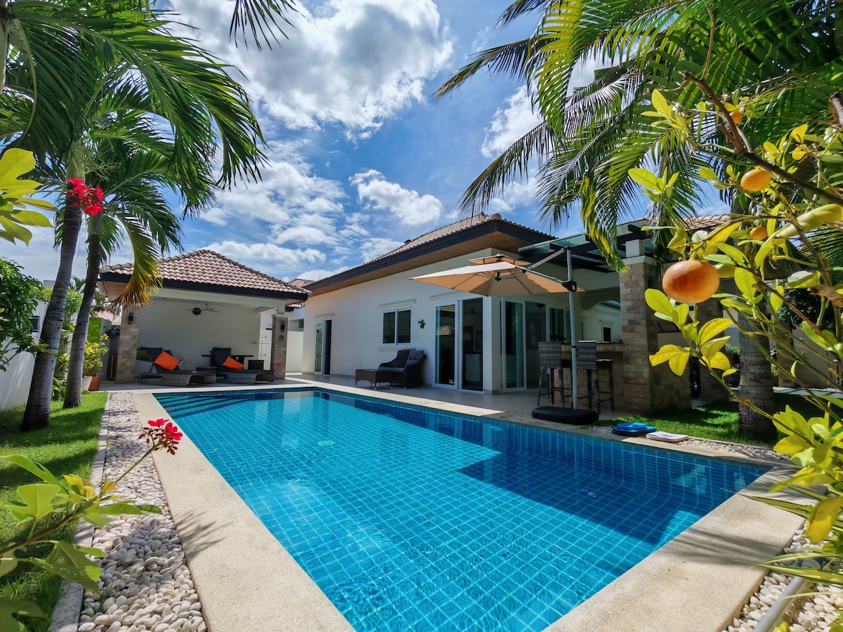 A private Pool Villa — The Sand and I Private Pool Villa, Unwind at a private 4-bedroom, 5-bathroom pool villa right in the heart of Hua Hin and steps to the beach. Enjoy a bright living room with a big-screen TV and streaming on Disney+ and Netflix—perfect for cozy movie nights after a beach day or golf round. Entire villa and private pool—your group has full and exclusive use during the stay.