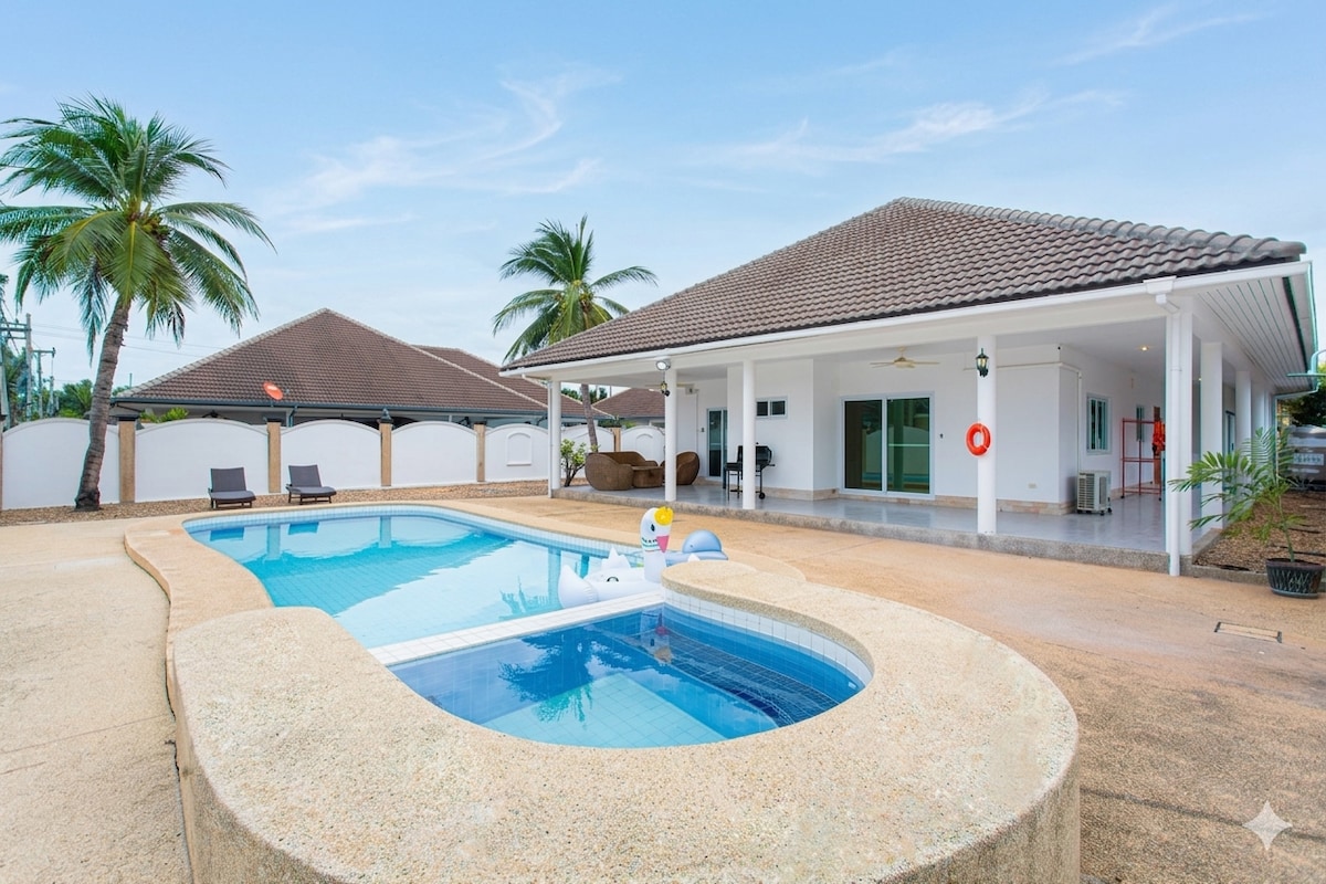 这是一栋令人惊艳的花园泳池别墅,所有的一切都是崭新且现代化的。别墅位于HuaHin114巷,非常靠近市中心。这里是一个社区型别墅,并有24小时门卫值班。400米内有711,cj超市,和当地人菜市场。开车到两个大型购物中心Blueport和Market vliiage 只需要3-5分钟。开车5分钟分别可以到达著名的华欣夜市和周末蝉夜市,Grab和Bolt打车都十分的方便快捷。别墅内设施齐全,客厅拥有200度广角的整面超大落地门窗,75寸超大智能电视,包含Netflix等项目,超大组合沙发,适合多人一起观看和休息。干净宽敞的现代化厨房拥有完善的设备可以制作美食,双开门智能冰箱能满足度假期间所有食物的储存需求。三个宽敞明亮的大卧室,其中两个卧室是全落地门窗的泳池景观,所有卧室都设置了遮光窗帘,床品均为120支贡缎全棉,柔软舒适,可以拥有完美的睡眠,我们还有很多方便带婴儿和低龄儿童家庭的设施,例如:婴儿床,儿童餐椅,脚踏凳,以及儿童马桶垫。花园内有4*9米的超大私人泳池,全套户外餐桌椅和遮阳伞,两把太阳椅,烧烤设备和吸烟区。我相信在这里或让您度过一个难忘且美好的假期。我们期待您的到来!