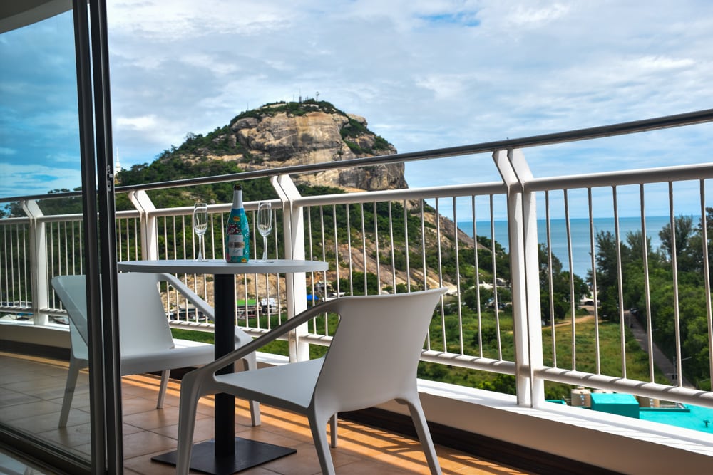 Genieße die Sonnenaufgaenge auf dem Balkon im 8. Stock. Eine neue , vollausgestattete Wohnung im Herzen von Hua Hin bietet Erholung und auch Spass. Das La Casita, inspiriert von spanischer Architektur mit einzigartigen Abmessungen und gross angelegtem Pool, liegt lediglich 300 Meter vom Strand entfernt. Wir lieben dieses schoene Apartment , ganz besonders die Design Schaukelstuehle auf dem Balkon.