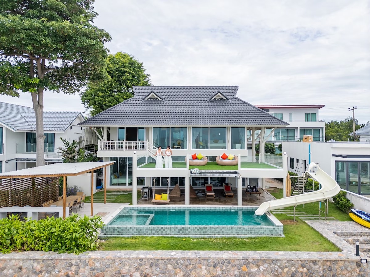 Private Beachfront Pool Villa in Cha-Am Enjoy a truly private seaside getaway at our beachfront villa with private beach access. The house features 5 bedrooms, 4 bathrooms, a private swimming pool with slide, pool table, karaoke, and a fully equipped kitchen. Perfect for families or private groups of 12–15 guests who want comfort, fun, and complete privacy. Relax, cook, sing, and enjoy the sea — no shared spaces, just your group.
