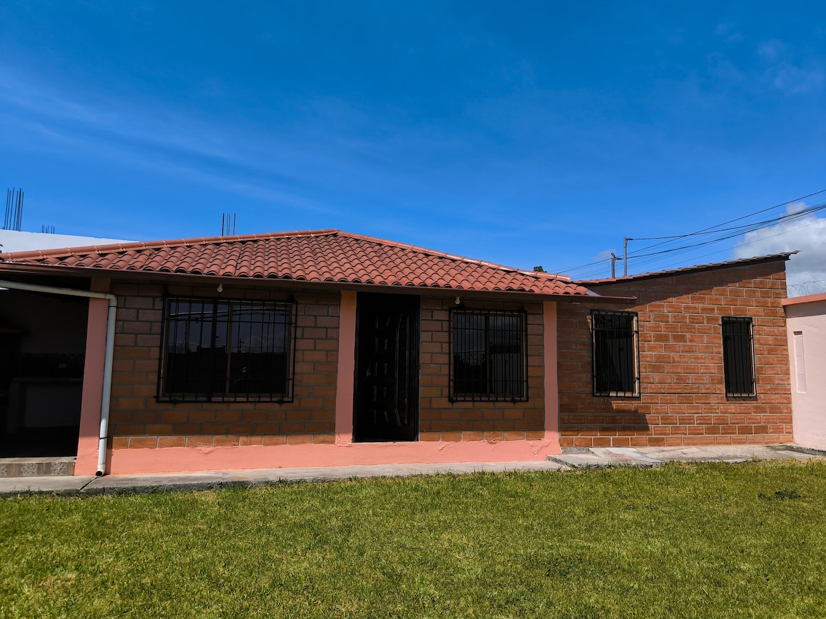 Casa con garage independiente. Localizada a 3 mins del nuevo terminal de buses del sur, a 7 minutos del Mall de los Andes en auto a 5 mins en auto de la Universidad Técnica de Ambato. Tiene 3 habitaciones, 1 habitación máster(cama de 2 plazas 1/2) con baño independiente,2 habitaciones stándars. Sala acogedora con wifi, chimenea eléctrica y plasma de 60 in. Cocina equipada con horno, refrigerador y accesorios de cocina. Área al aire libre para el descanso.