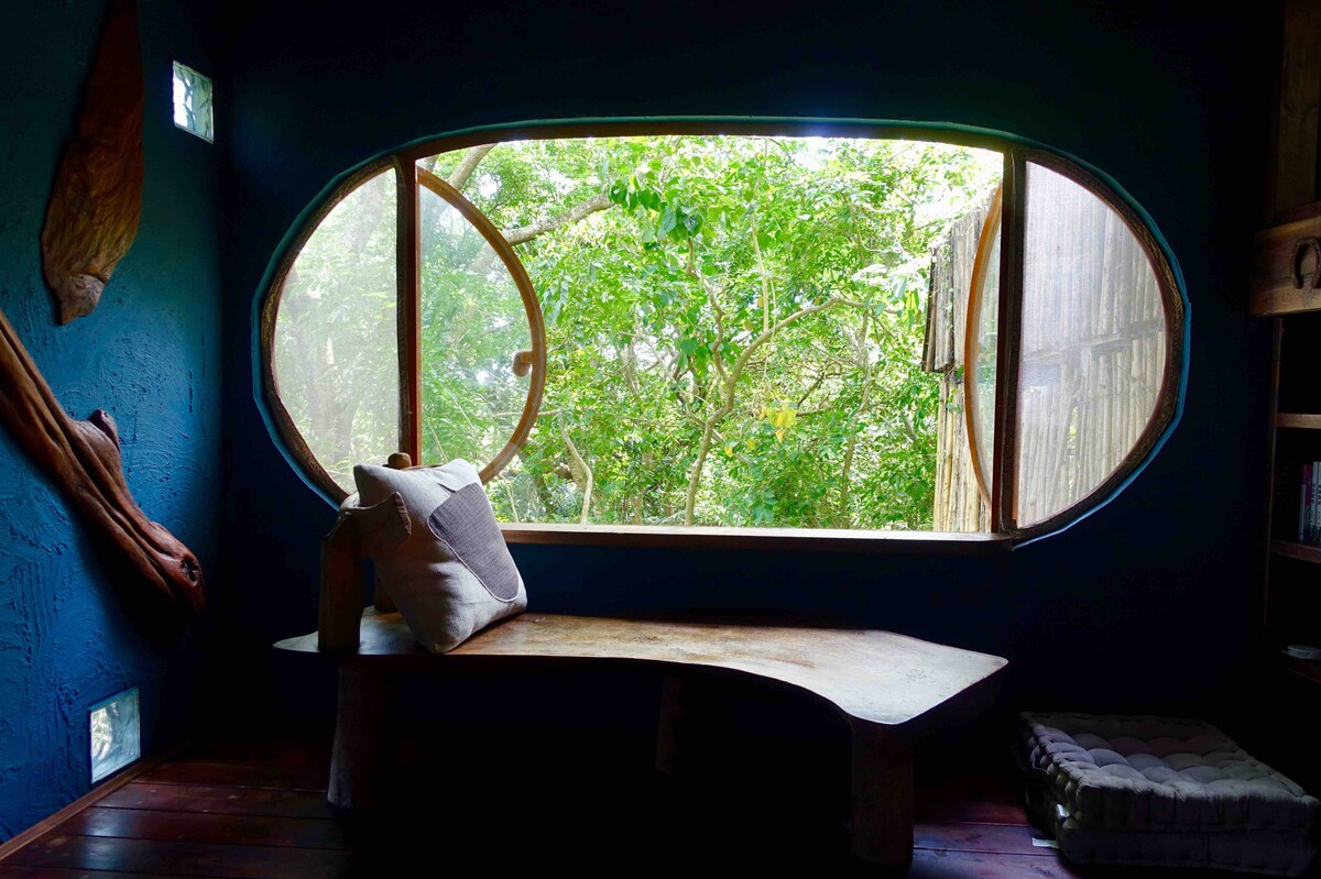 Real hearty hearth. Open air bathtub with privacy. Awsome view of vast natural forest, with the sea horizon at the far end. Red wood furnishing, red lazy bones. A full shelf of books to be your compnay. Be a lazy bone in the Paradise of Lazy Bone!