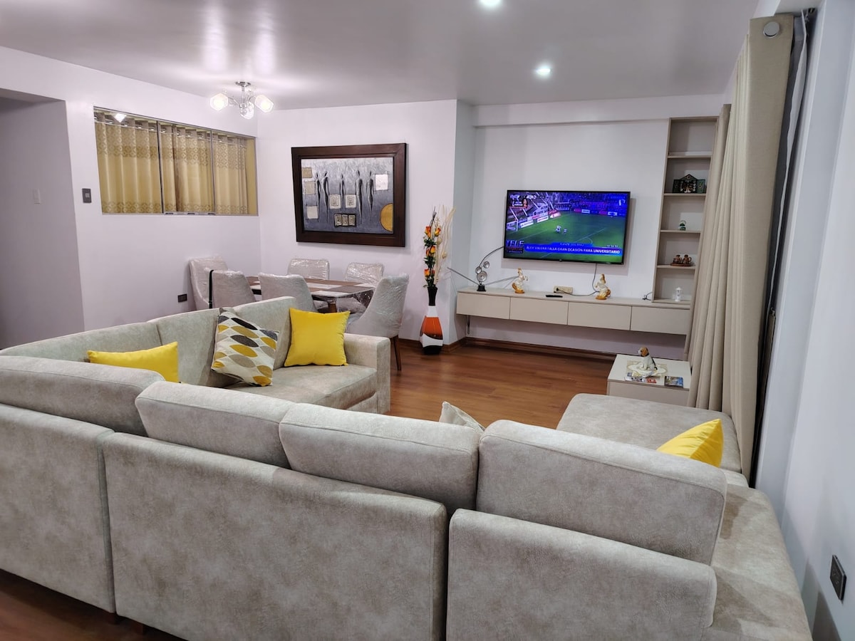 Acogedor y luminoso departamento en 7mo. piso con ascensor , preparada para hospedar cómodamente a 5 personas, en donde el espacio y bellas vistas te permitirá disfrutar días de descanso total. Esta ubicado en zona residencial muy segura , el edificio privado con vigilancia 24h a tan solo 10 min del centro de la ciudad, a una cuadra del Parque de la Identidad uno de los principales lugares turísticos de la ciudad y cerca de la universidad Continental.