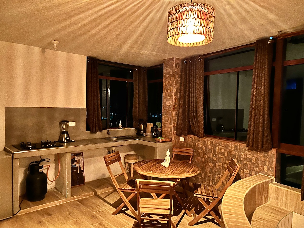 La habitación/ apartamento está ubicada en un tercer piso con vista al atardecer y amanecer. La mayor parte de nuestras paredes son de mamparas permitiendo una hermosa vista al cielo. Contamos con un proyector en el interior de la habitación con cuentas de Netflix, HBO, Amazon y Disney disfrutando de una gran pantalla como si estuvieras en el cine; también tenemos una piscina o jacuzzi, cocina, parrilla, baño, patio, comedor y unos libros todo. La mejor opción para relajarse sin interrupciones.