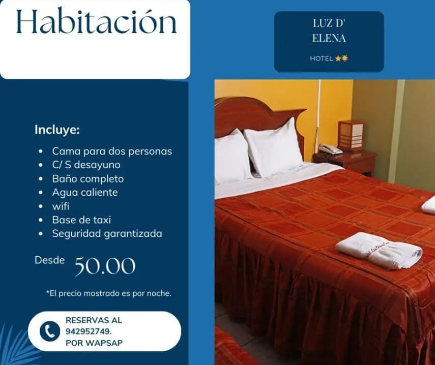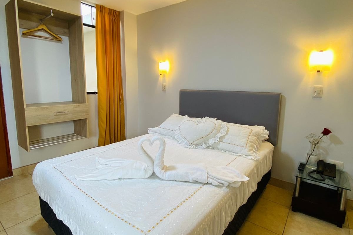 Habitación individual ubicada en Hotel tres estrellas en Trujillo. Cuenta con baño privado, agua caliente, wifi, tv cable, escritorio, closet, cortinas black out. Está incluido el servicio de desayuno americano en nuestra cafetería. Nuestro hotel cuenta con estacionamiento privado, ascensor, guardaequipaje y atención las 24 horas. Estamos ubicados a 2 cuadras de la Av. España. A solo 5 cuadras de la Plaza de armas de Trujillo.