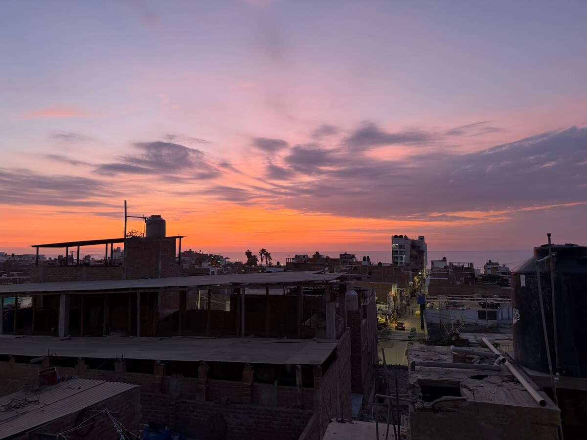 Encantadora y amplia casa de 3 dormitorios en Huanchaco 🌊, a pocos minutos caminando de la playa. Ideal para familias o grupos (hasta 8 huéspedes). Disfruta de su terraza y azotea con vista al mar y a la iglesia ✨, espacios iluminados, frescos y bien ventilados. Cuenta con cocina equipada 🍳, comedor, Smart TV 55” 📺, lavadora 🧺 y plancha. Ubicada en zona tranquila, cerca del malecón, restaurantes y tiendas 🏖️. A 10–12 min del aeropuerto ✈️.