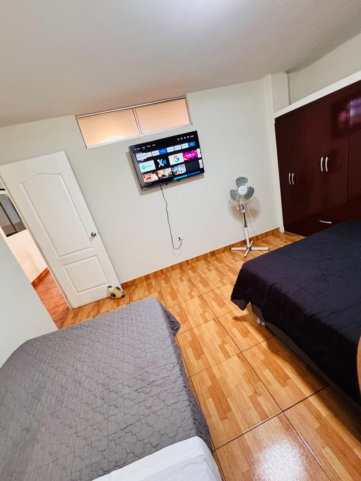 Mini Dpto. totalmente equipado, independiente, ubicado en el primer piso con 2 puertas, Una a la cochera y otra a la calle. El alojamiento es privado, confortable y práctico, con cocina, cama matrimonial para 2 personas, y un camarote con 2 camas, una sala con sofá cama, ubicado a 10 minutos de la ciudad de Trujillo, te conectamos con agencia de turismo de confianza que te pueden recoger de la casa, El lugar no es residencial pero muy cómodo.