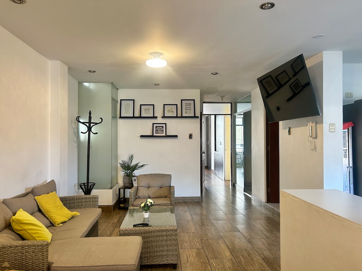 CAMA KING. Disfruta de la sencillez de este alojamiento tranquilo, con EXCELENTE UBICACIÓN, en La Merced, con ubicación céntrica, segura y residencial. Con restaurantes y supermercados a una cuadra. Con TERRAZA PROPIA incluida, cocina completa, y cine en el cuarto. Lava- seca incluida. Todos los servicios.