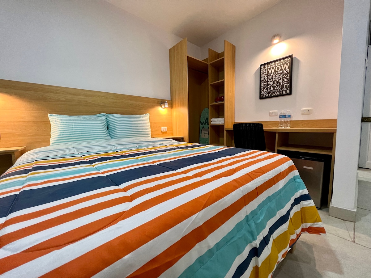 CAMA KING. Disfruta de la sencillez de este alojamiento tranquilo, con EXCELENTE UBICACIÓN, en La Merced, con ubicación céntrica, segura y residencial. Con restaurantes y supermercados a una cuadra. Con TERRAZA PROPIA incluida, cocina completa, y cine en el cuarto. Lava- seca incluida. Todos los servicios.