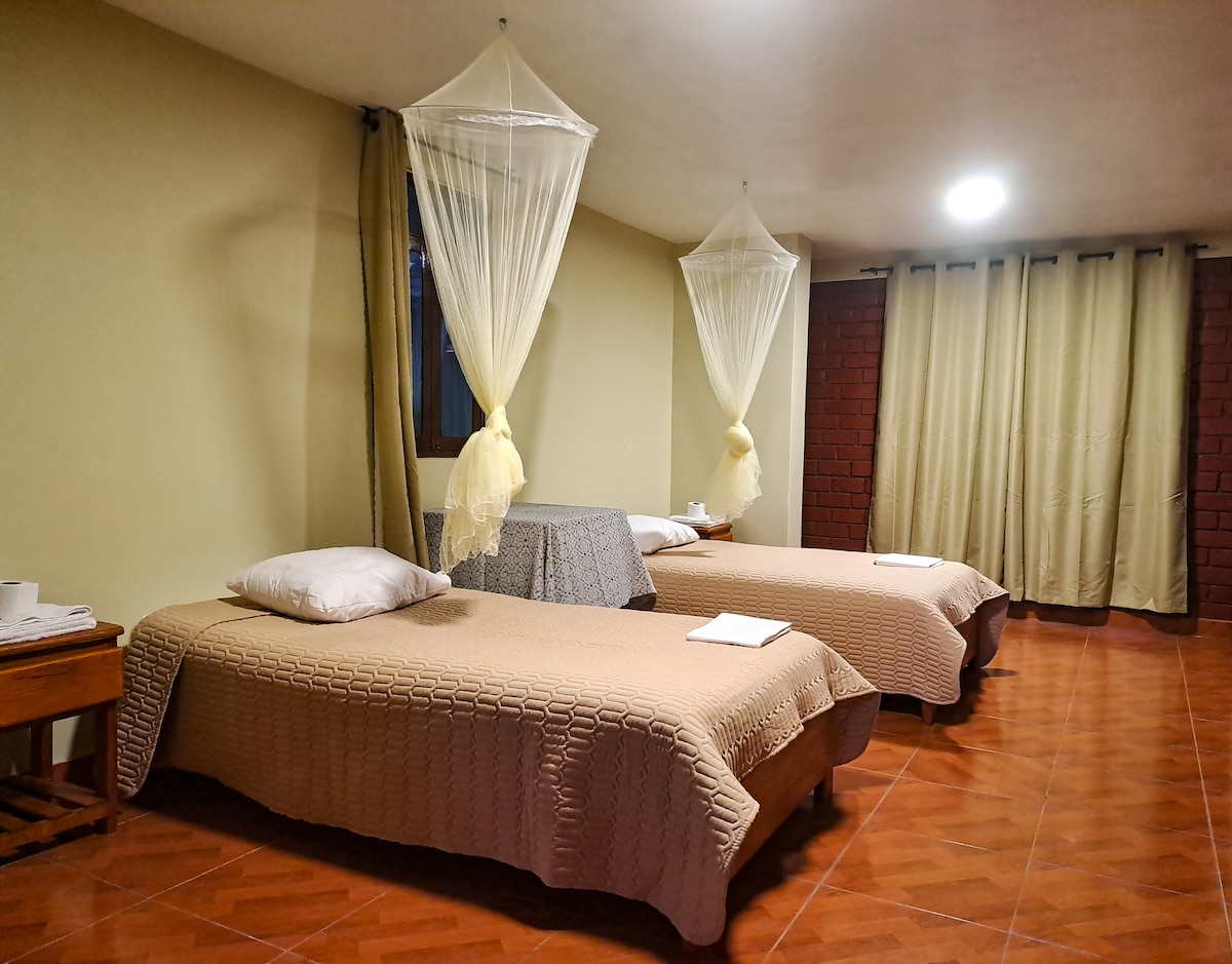Amrita Ecolodge is nestled within lush Amazonian vegetation close to the shores of Yarinacocha Lagoon. We are a small and humble center with a few cozy cabins, comfortable bedrooms and short nature trails in the back of our land. We offer a safe environment for pre and post dietas or to simply relax in a peaceful jungle atmosphere. • Lagoon ~ 5 min. walk • Yarinacocha ~ 15 min. ride • Airport ~ 30 min. ride