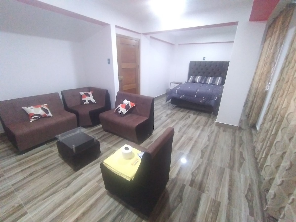 Te ofrecemos un departamento acogedor solamente para ti, está en el tercer piso de una casa en la av principal entre Huaraz y el aeropuerto; y a 10 minutos de la plaza de armas de Huaraz. Está cerca a la oficina principal del gobierno regional de Áncash, cerca al IPD Huaraz y en camino a Monterrey, Chancos, Carhuaz y a todo el callejón de Huaylas. Con mucho gusto podemos coordinar tu ingreso temprano por la mañana sin costo adicional, previa coordinación porque está sujeto a disponibilidad :)