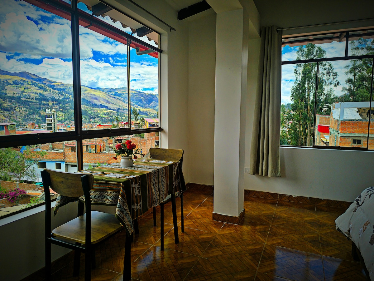Estimados Huespedes; Bienvenidos a Valentinos House, a 2 minutos caminando de la Plaza de Armas de Huaraz, tienes cerca lugares geniales para comer, pasear, centro comercial y gimnasios, no gastaras nada en transportes El departamento tiene una vista increíble a las montañas y al Parque Cuba, este lugar está lleno de luz, un gran lugar para relajarse y desayuna viendo los árboles y Montañas. Cuenta con una sala amplia, cocina equipada, patio, agua caliente, TV55", Internet de alta velocidad