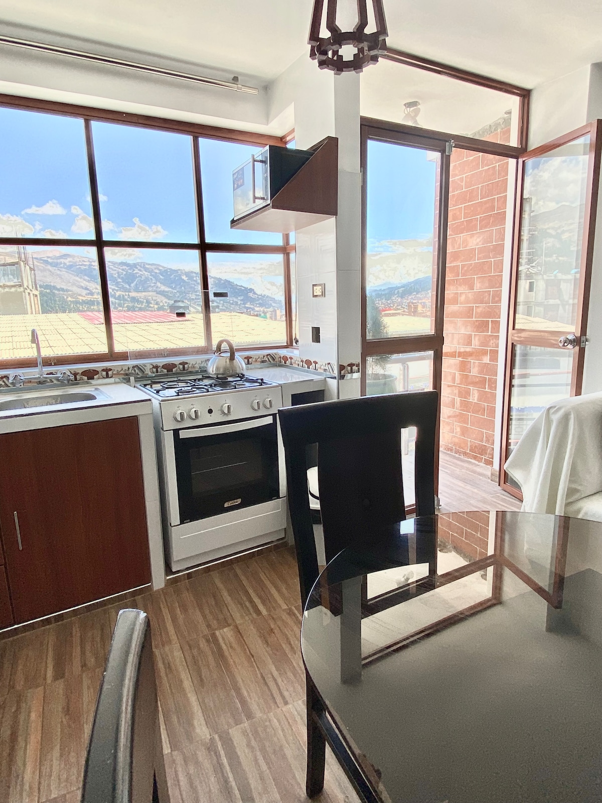El departamento es de uso exclusivo para los huéspedes, se encuentra en el primer piso, la habitación tiene baño propio, podrás disfrutar de la calidez de este alojamiento muy tranquilo y céntrico a solo 3 cuadras de la plaza de armas. Puedes acceder a la cocina, sala, comedor y baño. Dispone de agua caliente en las ducha y cocina. Ideal para largas estancias.