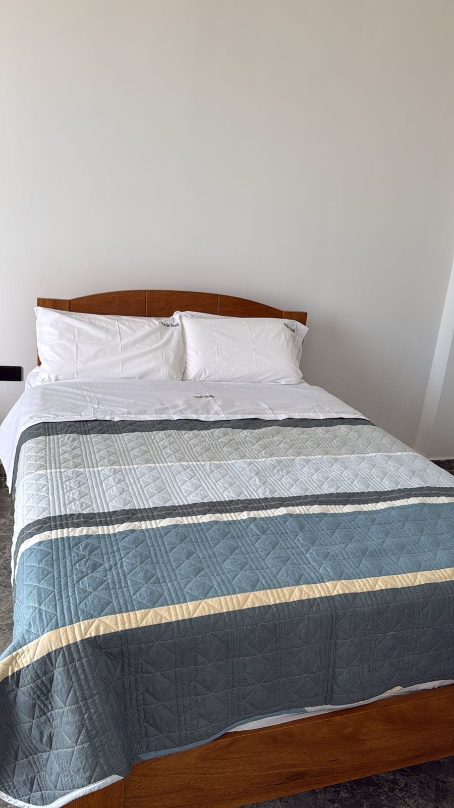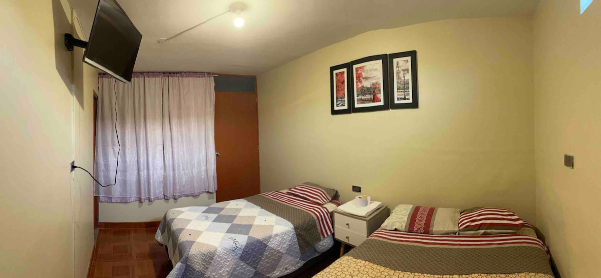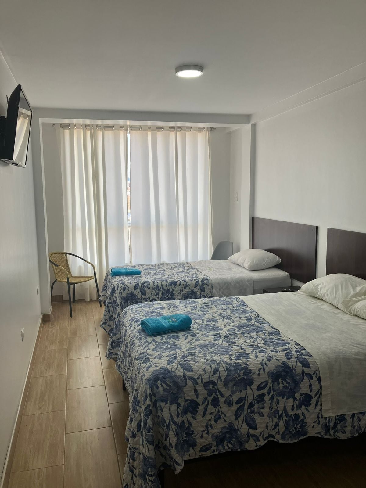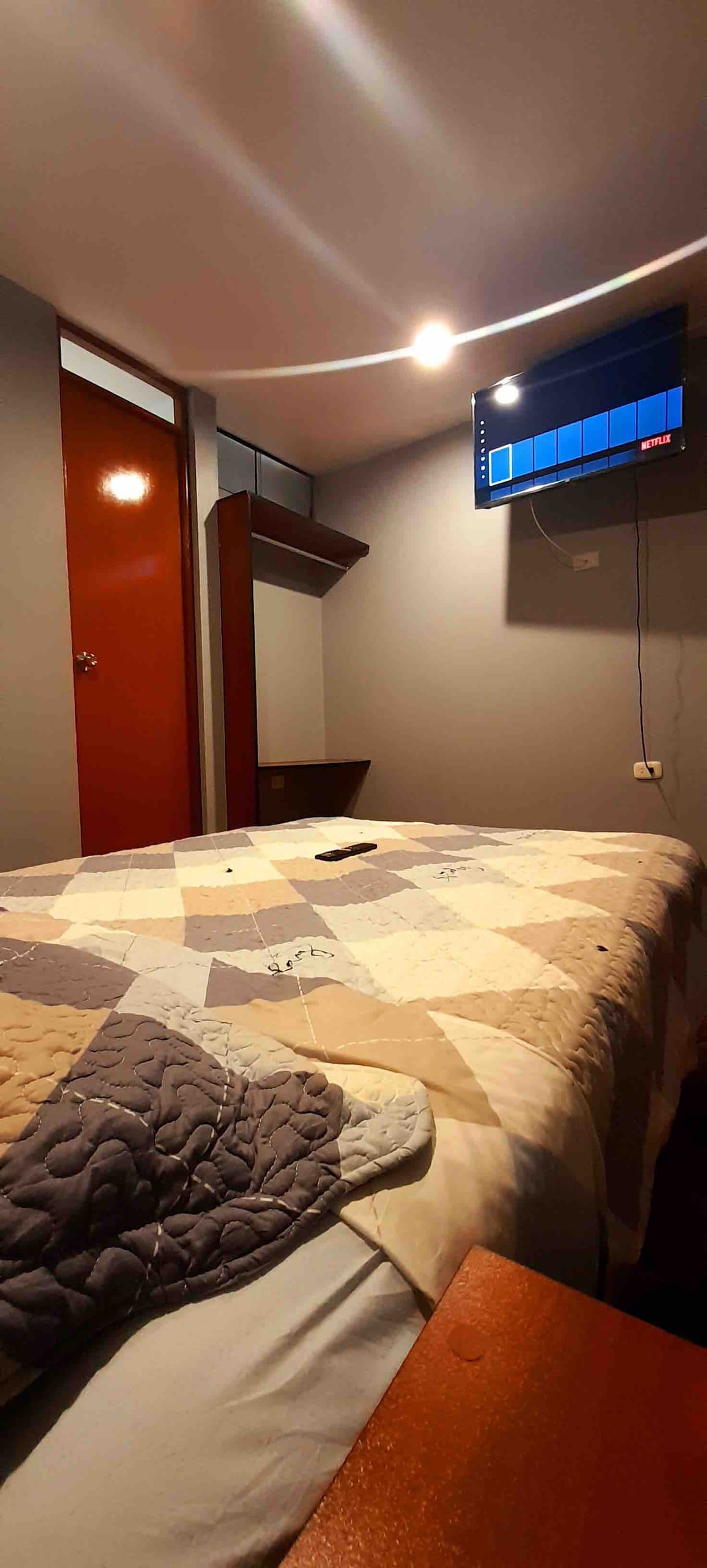 La habitación de la foto, puede tener hasta 3 personas, TV, WiFi, armario y baño privado, las atenciones son las de un hotel. El hotel se estrenó 2021. Es parte de un grupo hotelero con más de 20 años atendiendo familias, empresas y clientes corporativos. Ubicado en un zona residencial muy tranquila cerca al centro y a una cuadra de la avenida principal y 2 cuadras de la Panamericana Norte. Zonas comunes: 2 salas, una terraza con TV y kitchenette para compartir con amigos y una linda vista.