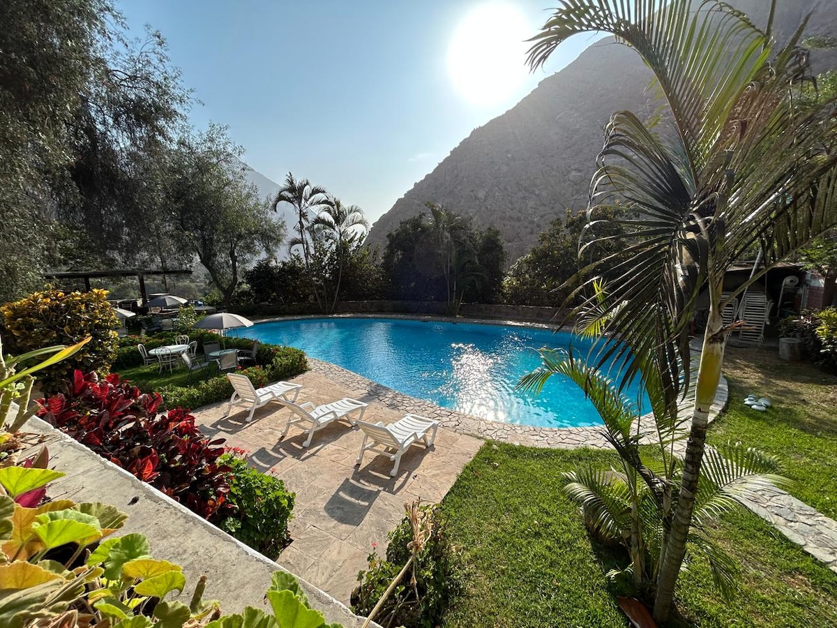 El MEJOR lugar para pasar unos días con amigos y familia! Chontay (a 10 min de Cieneguilla) Pet friendly Trekking en la zona (Río Lurin - Antioquia- Caminos del Inca) Parrilla Horno de barro Caja china Parrilla para cordero oh chancho al palo Piscina, 2 cocina equipada, 3 Salas de entretenimiento TV y muebles, billar, 7 habitaciones 22 cama), 4 baños, Cabaña zona fiesta: Bar, parlante, proyector, micrófono para karaoke. Zona de fogata con mesedoras. Discoteca zona segura 22 personas