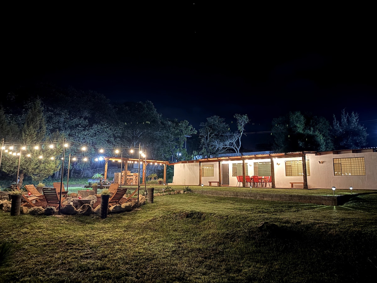 CASA DE CAMPO DE DISEÑO RUSTICO - CONTEMPORANEO, CON VISTA PANORAMICA. UBICADO A 10 MIN. CAMINANDO DEL CENTRO DE HUASCA. PUNTO CENTRICO HACIA LOS PRISMAS, LAS TRUCHAS, EL CENTRO DE HUASCA Y LA HACIENDA DE SAN MIGUEL REGLA DISFRUTA UN DIA DE RELAX EN MEDIO DE LA NATURALEZA, ASANDO CARNE, JUGANDO PIN-PON, CONVIVIENDO CON TUS AMIGOS AL EXTERIOR EN LA FOGATA O AL INTERIOR EN LA CHIMENEA. TE OFRECE WIFI- TV SKY - AGUA CALIENTE - COCINA EQUIPADA-RAMPAS PARA CAP. DIFERENTES - PET FRIENDLY AL EXTERIOR.