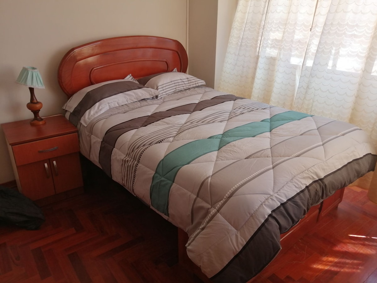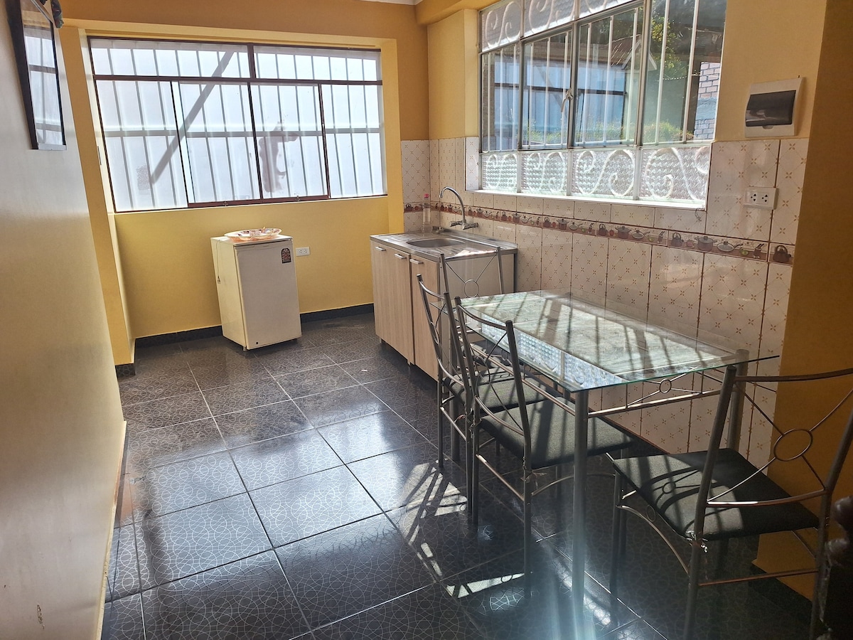 El departamento es de uso exclusivo para los huéspedes, se encuentra en el primer piso, la habitación tiene baño propio, podrás disfrutar de la calidez de este alojamiento muy tranquilo y céntrico a solo 3 cuadras de la plaza de armas. Puedes acceder a la cocina, sala, comedor y baño. Dispone de agua caliente en las ducha y cocina. Ideal para largas estancias.