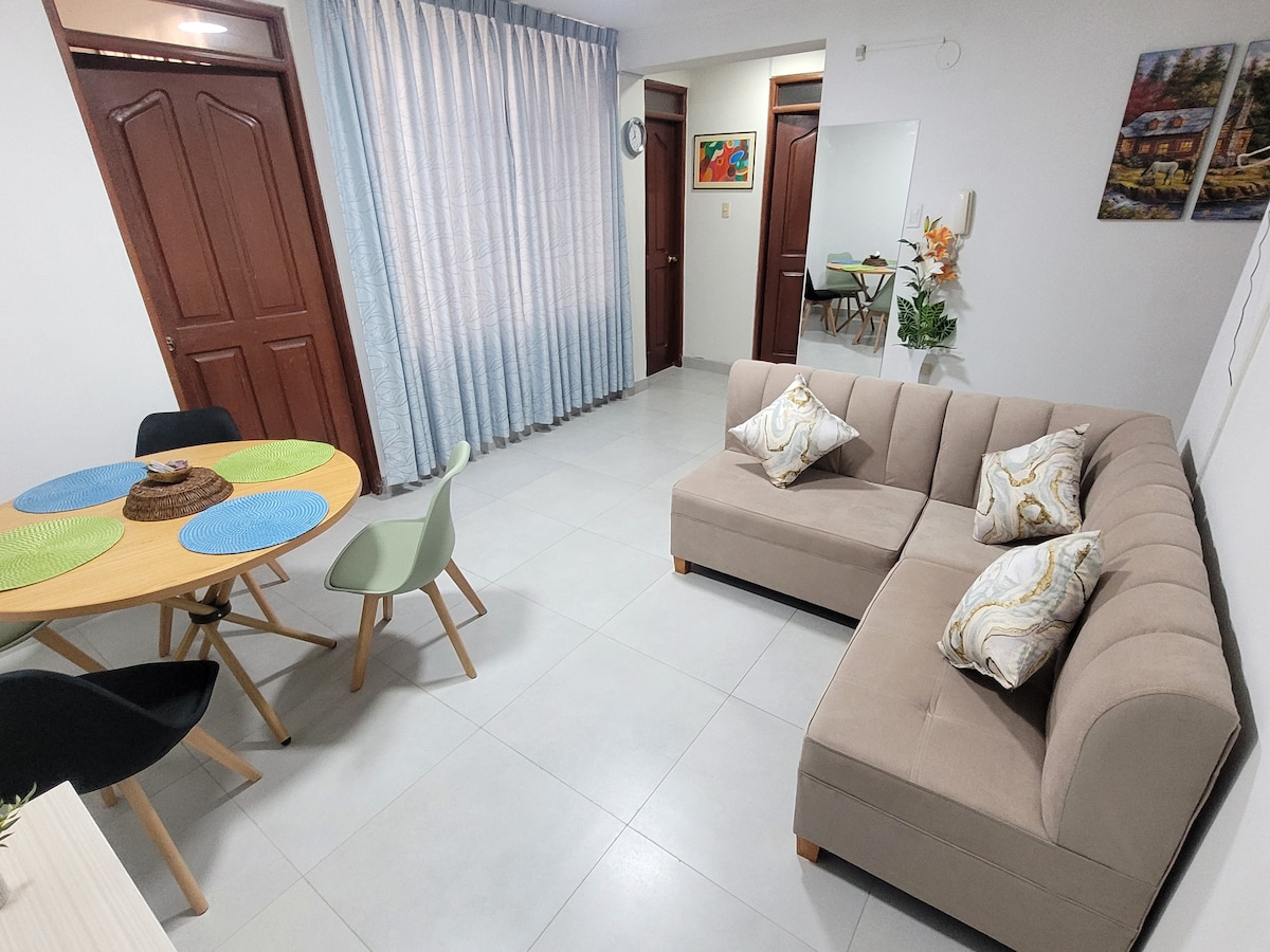 El departamento es moderno y elegante, con vista a las montañas, está en el 3er piso de un edificio independiente, dentro de un condominio familiar seguro y tranquilo, cap. max. 4 personas, con 2 habitaciones, cama Queen y TV, 2 baños, sala-comedor-cocina equipada, Wifi, lavaseca y cochera techada gratuita. Aprox. a 8 minutos en auto de la plaza de armas, restaurantes y estaciones de bus. Ideal para tu estadía personal, grupal o familiar en Huaraz; estoy segura que te sentirás como en casa.