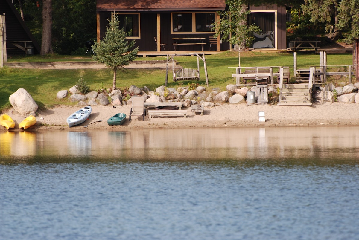 简单的湖畔小屋、皮划艇、海滩、桑拿、火。