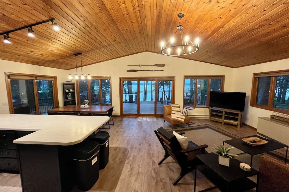 Anticipation awaits as you wind through 600 acres of the Paul Bunyan State Forest to the tip of the Jewel. There you will find Jewel Lodge on Mantrap Lake...where luxury meets the great outdoors. With 6 bedrooms, there's plenty of space for all your guests. This home just completed a major renovation in July 2024. Kitchen comes equipped with one full size fridge, one full size freezer, one full size wine/beer fridge, ice maker, dishwasher and oversized dual fuel 8-burner stove and double oven.