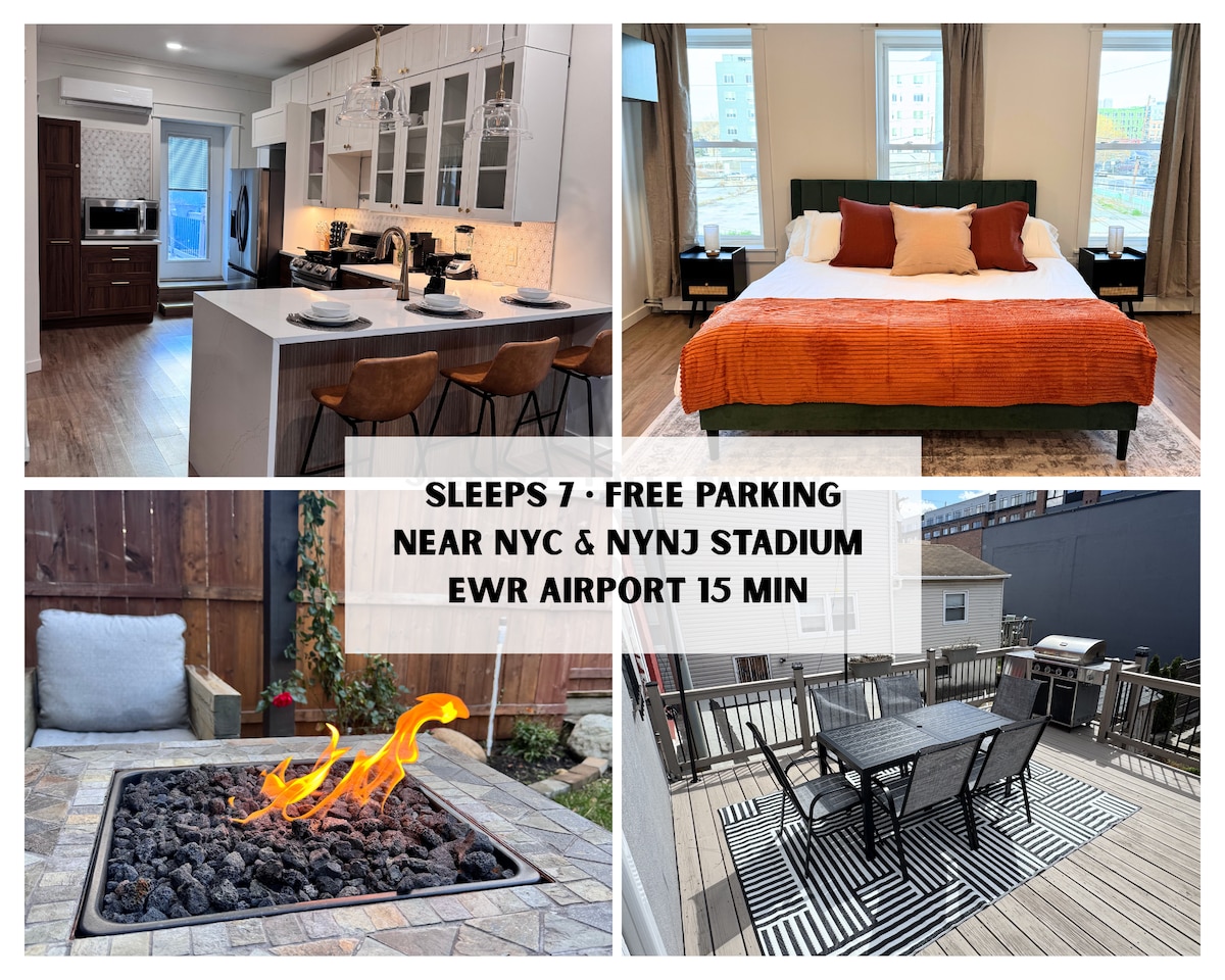 Welcome to EV Dream Stays ! Our 2BR North Bergen Haven is minutes from NYC, MetLife, MSG, Prudential Center, Red Bulls Arena, World Trade Center & American Dream. 🔌EV READY: Level 2 charging ($20/day) + Tesla adapter! Free private parking. 🏡THE SPACE: 2BR/1BA, full kitchen, plus a huge backyard with BBQ & fire pit. 📍TRANSIT: 2 blocks to NYC bus (35m to Times Sq/Statue of Liberty). ⚠️IMPORTANT: Garden-level unit, low ceilings (max 6'). Family home; expect daytime footsteps from above.