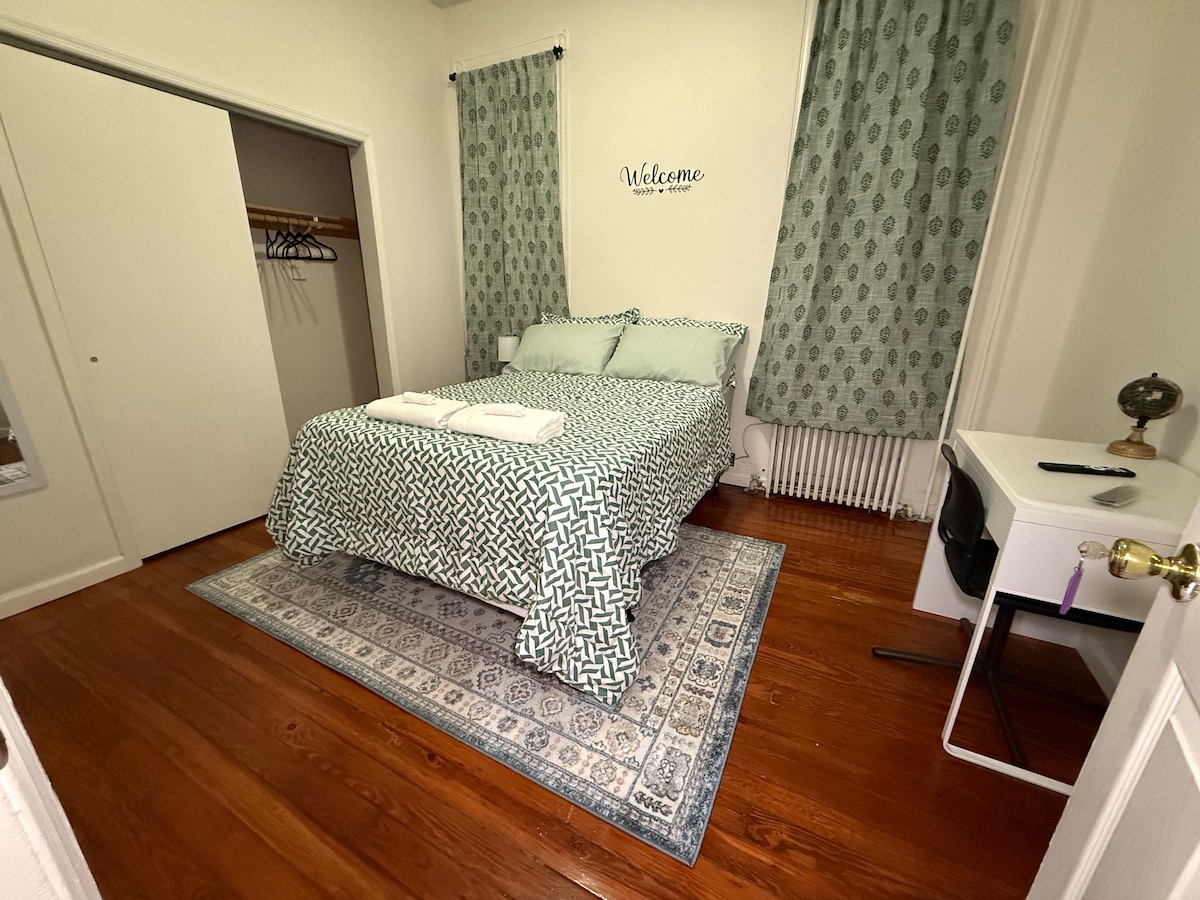 Welcome to your Jersey City Haven—a Wilder Co Properties stay! A sun filled home that is private and peaceful, this quiet apartment is on the top floor of a renovated historic home and has amenities for families, business travelers, and students alike, including queen beds, AC, WiFi, a smart TV, washer + dryer, sound machines, oven, dishwasher, and more! Beautiful + safe neighborhood with restaurants, shops and parks all within a few blocks, and NYC only a 10 minute train away. NO AIRBNB FEES!