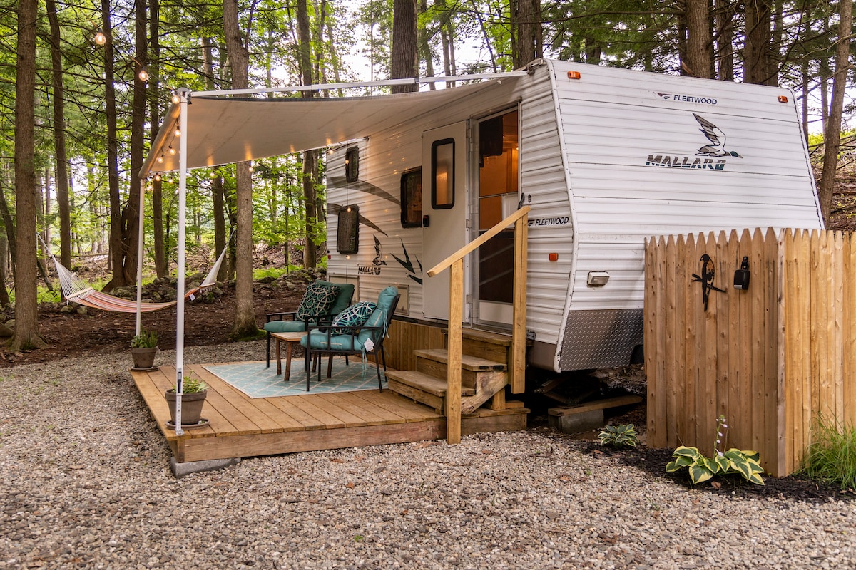 An old school camper, painstakingly renovated to give it a Scandinavian look in the front, and a cozy cabin feel in the bedroom. Extra insulation keeps it warm even on zero degree days! It has flushing toilet, hot shower, AC and a mini kitchen. Located two hours from NYC and close to Hudson, Kaaterskill falls and ski slopes! *Hudson Getaways is a small woman owned business. We offer discounts to our social media followers, to returning guests and during slow seasons.