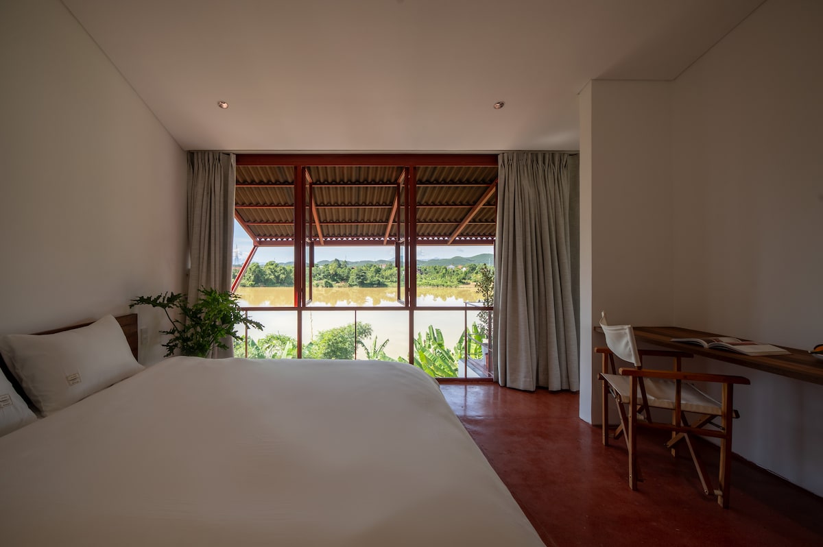 Horizonphile là căn phòng nằm ở tầng cao nhất của Scarlet Pavilion, sở hữu tầm nhìn bao trọn sông Hương và dãy núi phía xa. Thiết kế mở với vách kính đỏ nổi bật và hiên ngồi riêng nhìn thẳng ra mặt nước, khiến mỗi buổi sáng trở thành một bức tranh sống động của thiên nhiên. - View panorama đặc sắc nhất Scarlet Pavilion: từ giường ngủ đã có thể ngắm trọn bầu trời, mặt sông và rặng núi xa. - Bồn tắm riêng bên hiên, nơi ánh sáng tràn ngập và gió tự nhiên.