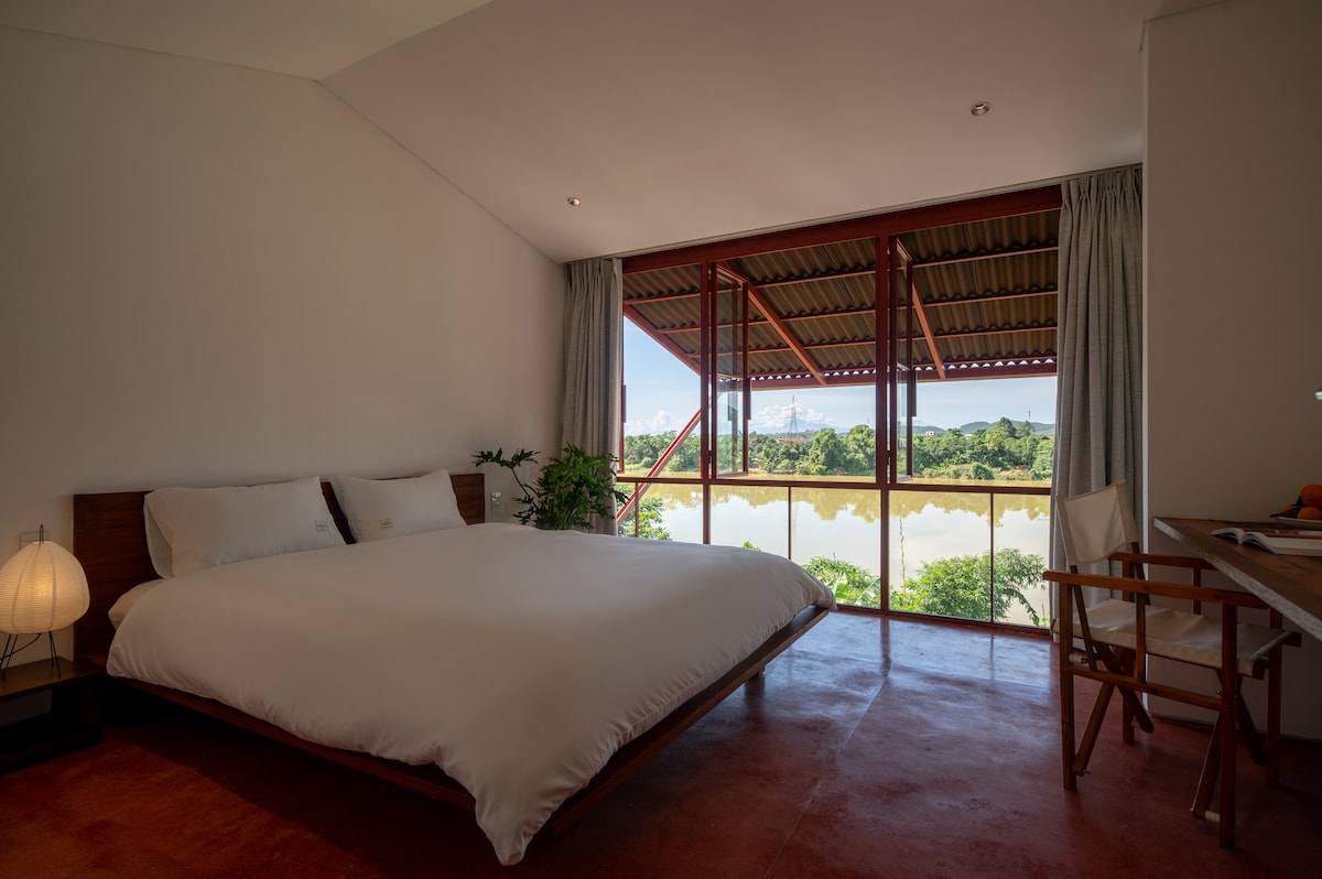 Horizonphile là căn phòng nằm ở tầng cao nhất của Scarlet Pavilion, sở hữu tầm nhìn bao trọn sông Hương và dãy núi phía xa. Thiết kế mở với vách kính đỏ nổi bật và hiên ngồi riêng nhìn thẳng ra mặt nước, khiến mỗi buổi sáng trở thành một bức tranh sống động của thiên nhiên. - View panorama đặc sắc nhất Scarlet Pavilion: từ giường ngủ đã có thể ngắm trọn bầu trời, mặt sông và rặng núi xa. - Bồn tắm riêng bên hiên, nơi ánh sáng tràn ngập và gió tự nhiên.