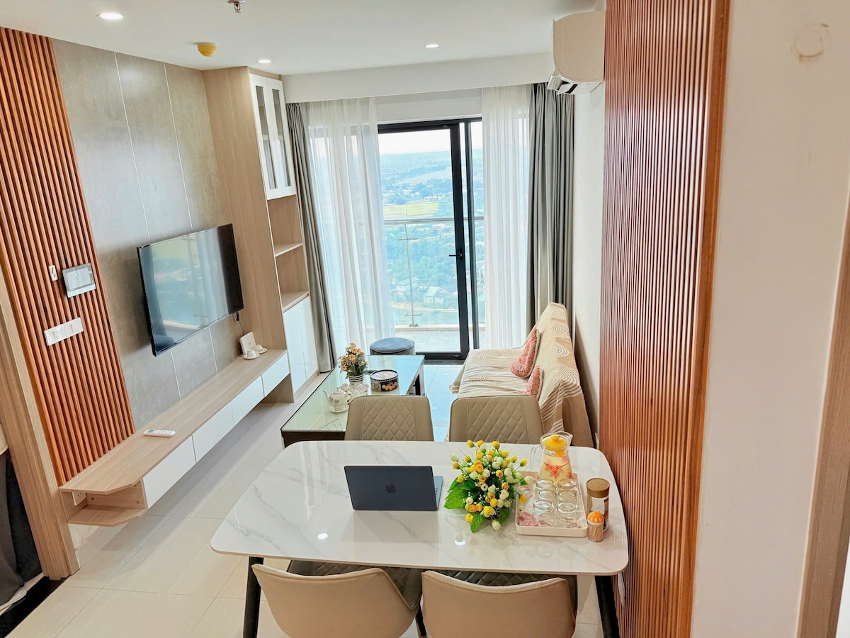 - 2 bedrooms, 2 bathrooms, and a large sofa bed - Balcony and windows with views of the pool and the city - Conveniently located near popular tourist attractions and dining areas - Spacious living room with a dining table, perfect for families - Free access to the swimming pool and gym in the building - Fully equipped with amenities: air conditioning, internet-connected TV, refrigerator, washing machine, dryer, kitchen, and cooking utensils,..