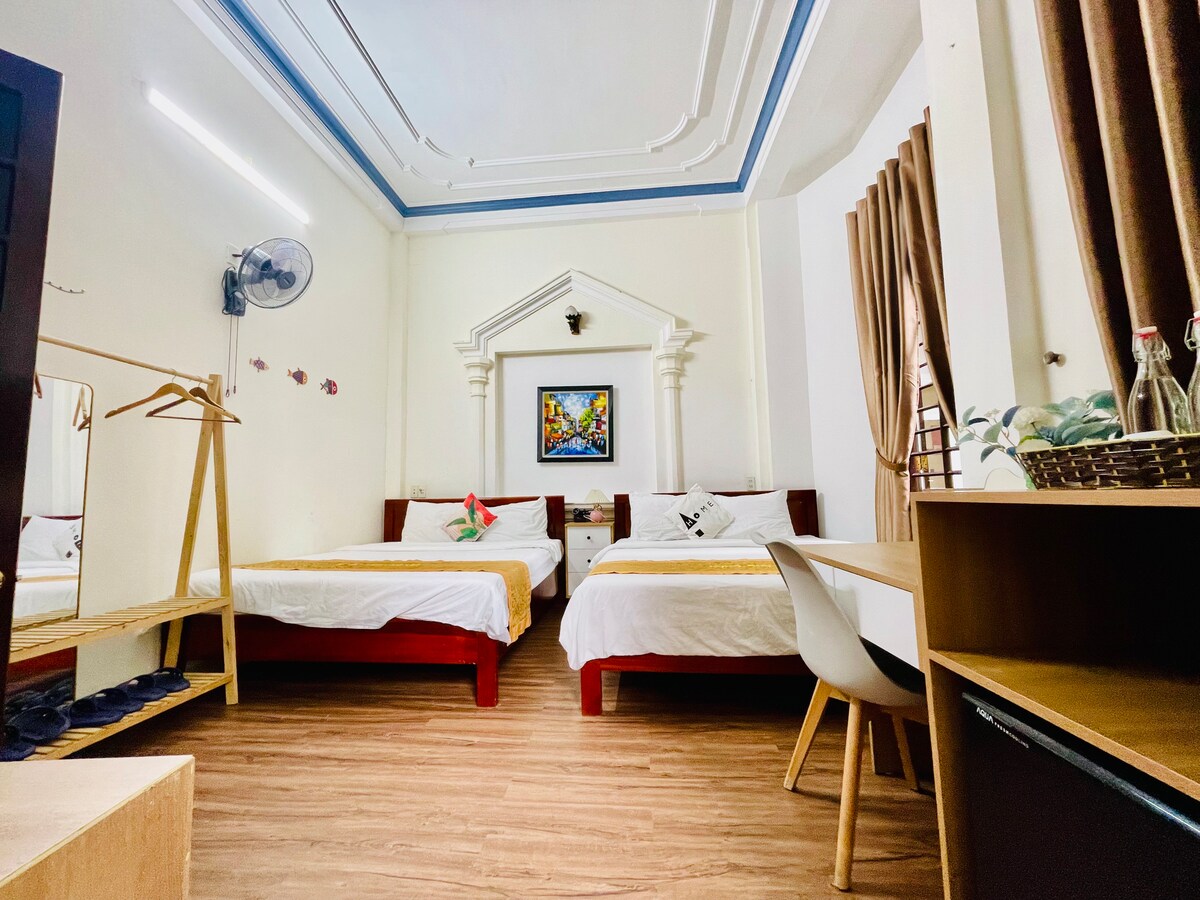 Spacious family room for up to 4 guests with a private balcony at Eva Homestay. Enjoy natural light and fresh air, creating a relaxing and peaceful atmosphere. Located in the heart of the city, close to the walking street, night market, local food restaurants, and just a 3-minute walk to the Huong River. Shared living room and kitchen on the ground floor. Host available at all times. Breakfast not included (50,000 VND/person). Cooking class and street food available on request.