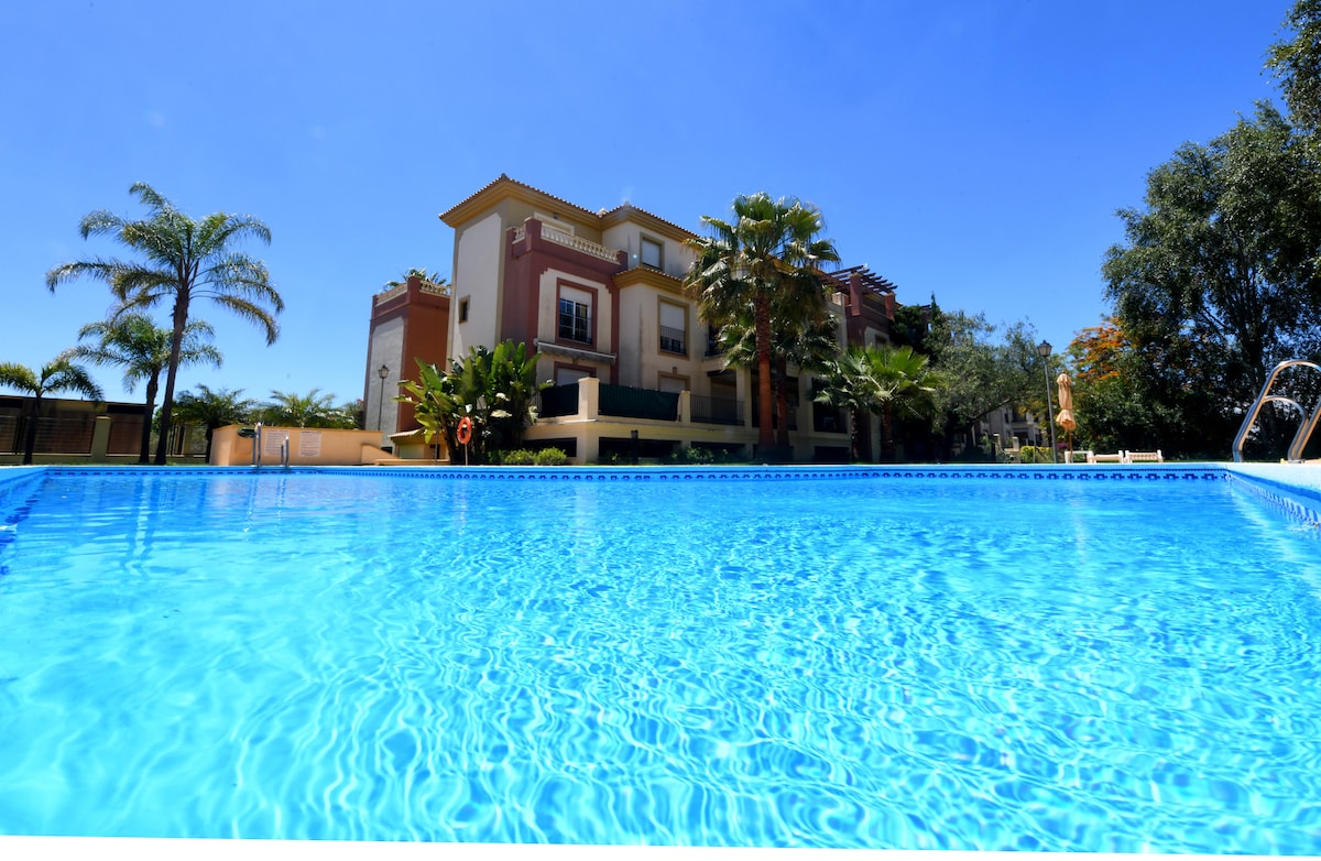 Tranquila casa en el Golf Resort de Islantilla, perfecto para familias, con piscina, Aire Acondicionado, amplísima terraza, pistas de pádel y tenis, parque, lago, ¡Y mucho más! Tambien cuenta con bar/restaurante con pescado frito y otras comidas típicas (abierto sólo en temporada de verano). La playa se encuentra a unos 15 minutos andando, aunque es preferible ir en coche o en trenecito 🚂 que tiene parada justo en la urbanización y baja hasta la playa, centro comercial y zona de hotelera.