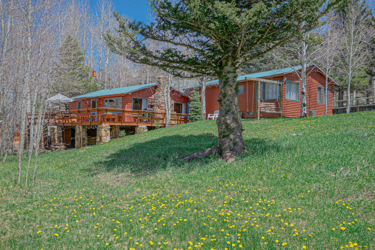 Cozy, Rustic Oak Log cabin within a very quiet natural surrounding for a Mountain getaway! Tall Ponderosa pines and wildlife everywhere. A billion stars at night. A chance to "unplug" and enjoy natures beauty of the Spanish Peaks and Sangre de Cristo range. Dog friendly. Great place to stop if you are driving thru Colorado this summer. No more than 6 in the cabin but Plenty of room for parking your own RV’s or pitching tents for small added fees. Total of 12 guests. No RV hookups,dry camping