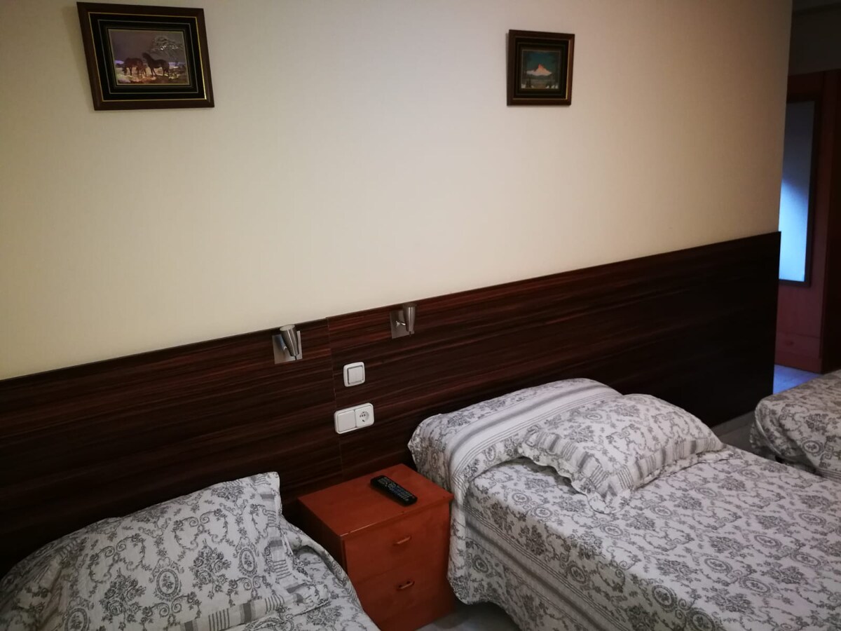 Habitación con 2 camas individuales con baño y balcón .