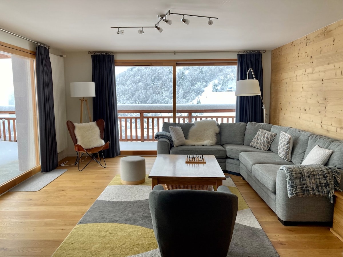 Nieuwbouw luxe appartement 95m2 op de skipiste, 3 slaapkamers en een extra cabine met een stapelbed,een totaal van 8 bedden, met een gemeenschappelijke wellness, sauna/hamam , fitness en een zwembad. Je kan gratis parkeren in 2 ondergrondse garages. Mogelijkheid tot leveren van brood via de receptie desk. Het appartement bevindt zich op de derde verdieping, heeft een groot zuid gericht terras en een mooi uitzicht op het dorp en de bergen.